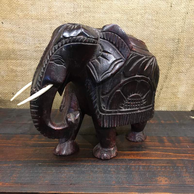 MAHOGANY WOOD DRESSED CARVING ELEPHANT – TRUNK DOWN WITH TUSKS